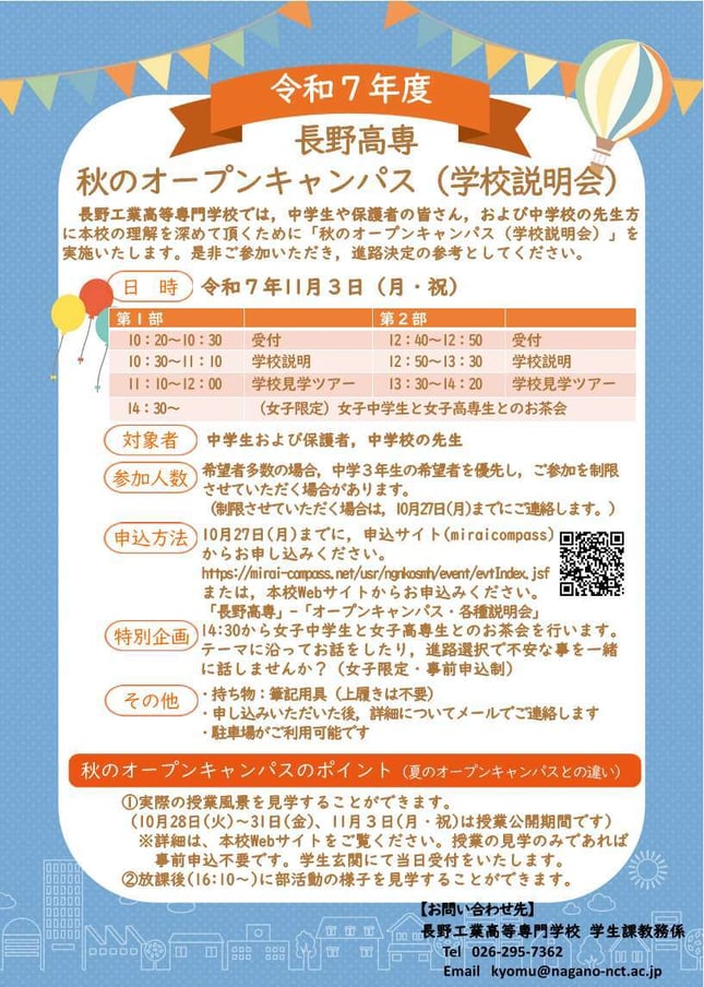 長野高専に興味を持っている中学生や保護者の皆さん、および中学校の先生方向けに、長野高専の理解を深めて頂くために「秋のオープンキャンパス(学校説明会)」を実施します。